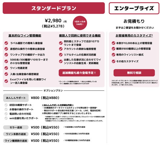 弊社は、新たにエンタープライズプランを導入することで、お客様からのカスタマイズリクエストにお応えしています。ビジネスシーンの多様化によって、企業ごとの特別な要求や細かな調整が必要とされています。通常のサービスでは対応しきれない部分を補完するために、エンタープライズプランを追加することとしました。この新機能により、ホテルやレストランチェーンなどの大規模なビジネスニーズにも対応可能となります。具体的な機能としては、在庫管理の改善、ワインリストの自動化、業務の効率化などが挙げられます。