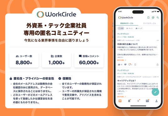 2023年3月8日にリリースしたWorkCircleは「テック業界・外資系企業で働いている」という共通点を持った人々が繋がり、自由に本音で語り合える匿名コミュニティです。