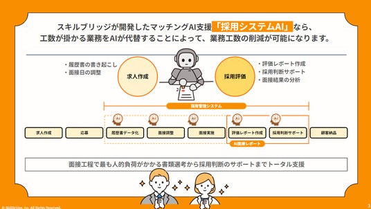 AI技術を使って企業の採用業務を支援するスキルブリッジ株式会社(所在地:神奈川県横浜市、代表取締役:佐藤 元輝)は、2024年6月26日「採用システムAI」のシステム販売を開始しました。
