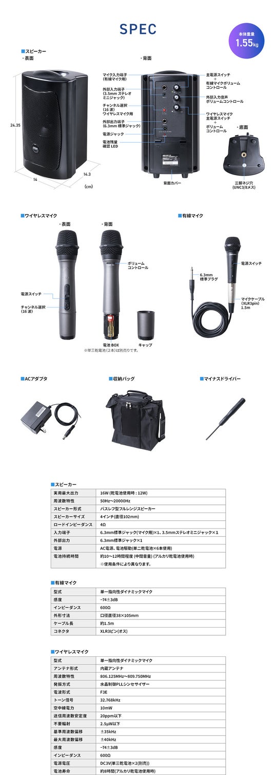 ワイヤレスマイク付 拡声器 スピーカー コンパクト 16W 有線マイク付 電池/コンセント対応 持ち運び