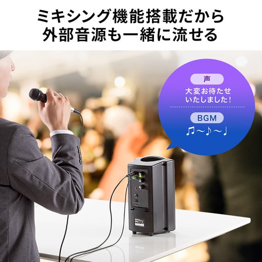 音楽や外部入力からの音声をミキシングして出力できる機能も搭載。更に、三脚ネジ穴を備え、スタンド付スピーカーとしても使用可能です。