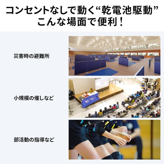 電源は家庭用コンセントと電池駆動の2WAYに対応しており、屋内外で幅広く使用できます。
