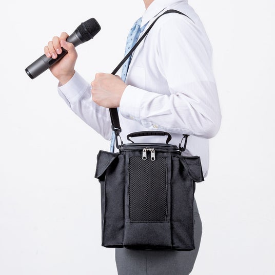 ACアダプタ駆動、乾電池駆動の両方に対応した持ち運びもしやすいバッグと取っ手付きで16W出力可能な会議や講義、イベントなどで手軽に使えるワイヤレスマイク付き拡声器スピーカー