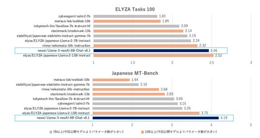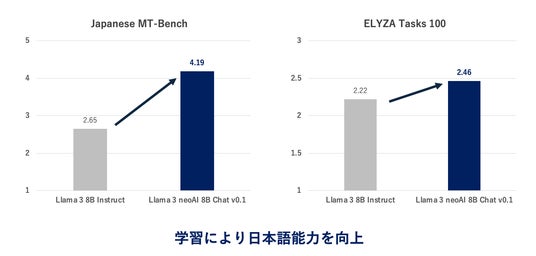 学習前の「Llama 3 8B Instruct」と学習後の「Llama 3 neoAI 8B Chat v0.1」の精度比較。2指標(Japanese MT-Bench、ELYZA Tasks 100)は、GPT-4-Turbo-1106-Previewによって評価。日本語性能を正しく評価するために、英語の出力を評価しない評価方法に一部改変。