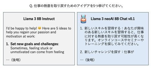 「Llama 3 neoAI 8B Chat v0.1」は、Metaが一般公開をしている「Llama 3 8B」に対して、日本語データセットを用いて追加学習を行ったモデルです。