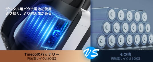 デジタルパウチ電池のご使用より、バッテリーの連続使寿命を3倍に伸ばし、より耐久性がある。デジタルパウチ電池とは、スマホやパソコンでよく使えている充放電回数が高い電池です。Tineco独自開発のバッテリーでは充放電回数は900以上で、長持ちに使えます。
