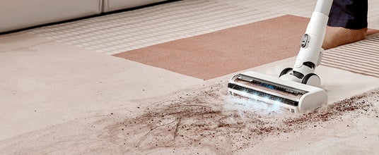 SwitchProモーターの切り替えや「ダストカップ+パイプ+絡まないブラシ」と組み合わせることで、カーペットや畳までのゴミなどを吸引できるスティッククリーナーにスイッチ。6つのマルチサイクロン・システムの搭載により、パワフルな吸引力や軽量化を同時に実現し、片手のみでカーペットや床の隙間の毛やホコリを吸い取ります。さらに、Tineco独自のからまないブラシの付けにより、毛絡みを防止できます。