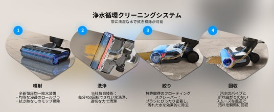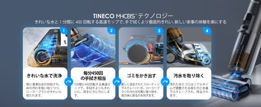 水拭き掃除機として、固形物・液体などを吸引しながら、水拭きします。醤油、ソース、カレーの食べこぼしから皮膚の汚れ、ホコリなどのあらゆる汚れを対応できます。なお、MHCBS(TM) テクノロジーによる4段階浄水循環スクーニングシステムの搭載により、常に綺麗な水、高速でモップを洗浄しながらで水拭き、汚いモップによる2度汚れの心配は徹底的に解消!床に汚れが広がる心配がありません。