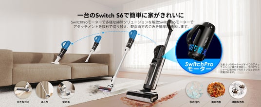 「Floor One Switch S6」は、日本家庭の省スペース収納や多種類の床材のニーズに応え、多様なアクセサリーを付属する多機能クリーナーです。SwitchProモーターの切り替えるだけで水拭き掃除機から、ティッククリーナー、ハンディクリーナー、布団クリーナーや天井クリーナーまで一台5役を実現します。