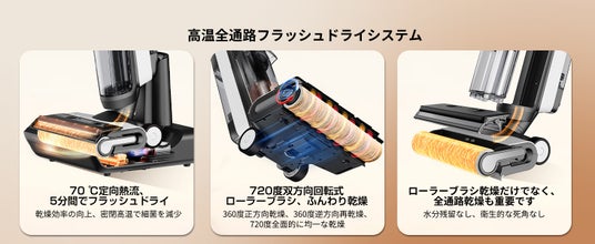 「Floor One Switch S6」は、業界初の高温全通路フラッシュドライ・システムを搭載し、「70℃*の高温除菌」、「720度の双方向回転式ローラーブラシふんわり乾燥」や「全通路フラッシュドライ」により、5分間でファルター、パイプからローラーブラシまで徹底清浄、除菌や密封乾燥を実現。
