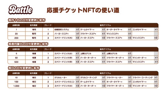 応援チケットNFTの保有数に応じて、『Cookin' Burger』のゲーム内アイテムを定期的に獲得できます。獲得できるアイテムは以下の通りです。