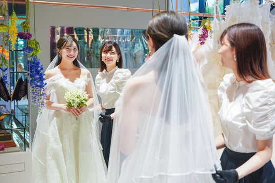 また、ウェディングドレスを当日着るだけでなく、ドレスショップでの試着体験も花嫁さまだけに許された特権です。様々なドレスを身にまとうたびに、新しい自分を発見できたり、ドレスショップごとの素敵な世界観に心を躍らせたり。そんな体験を提供することで、身も心も花嫁になる準備を整えていただきたいと考えています。