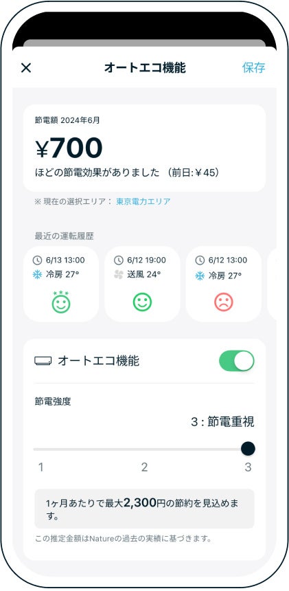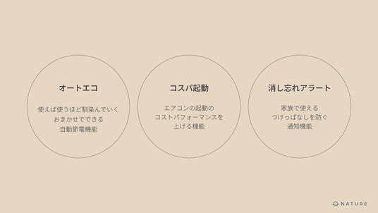 Nature Remo Lapisは、ユーザーのエアコン利用傾向や節電意向をもとに“がんばらない節電”の実現を約束します。そのための機能として「オートエコ」「コスパ起動」「消し忘れアラート」の3機能を搭載しています。
