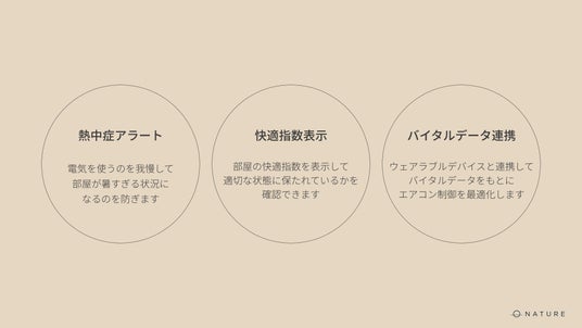 Nature Remo Lapisを使って、部屋の空気を調整し日々の体調をととのえていきます。そのための機能として「熱中症アラート」「快適指数表示」「バイタルデータ連携」の3機能を搭載しています。