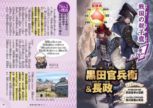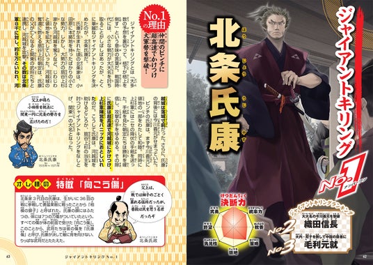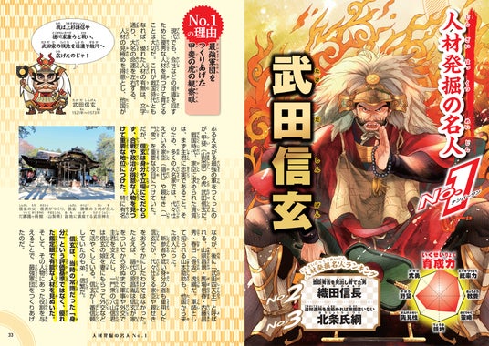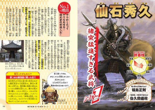 「戦国の革新者」「最強の猛将」「人材発掘名人」などの当時から誰もが認めるスゴイNo.1から、「かぶき者」「奇跡の復活」「大器晩成」などの後世になって評価されたNo.1、そして「信用ならない男」「裏切り者」「ヤンデレ」などの今だとちょっとヤバイNo.1まで、さまざまなNo.1武将たちを大集結させました。