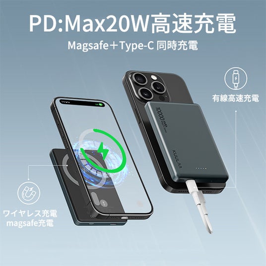 わずか12mmの薄さで10,000mAhの大容量。外出時にスマホのバッテリー切れもこのバッテリーがあれば心配なし。magsafe対応で装着しても気にならないスリムさ。有線も使えてで2台同時充電可能