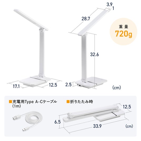 デスクライト LED 充電式 無段階調光 1200ルクス USBポート搭載 ホワイト