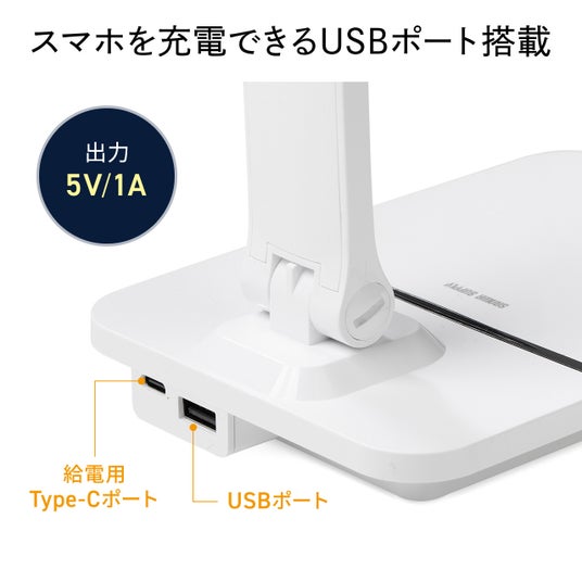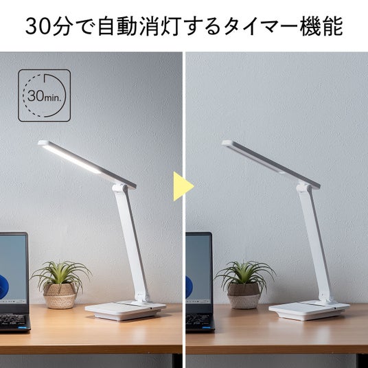 デスクライトの台座部分には、スマートフォンなどの充電に便利な出力1AのUSBポートが付いており、約30分で消灯するタイマー機能も内蔵されています。これにより、さまざまな利便性を提供します。