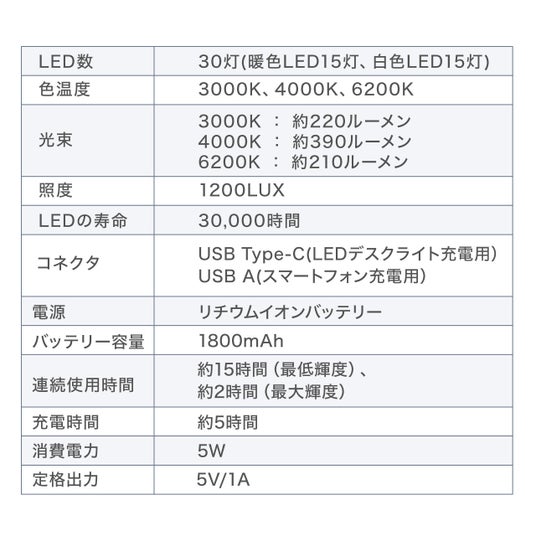 - 3段階の調色、明るさの調節、角度調整、スマホ充電機能、タイマー機能など充実した機能を搭載