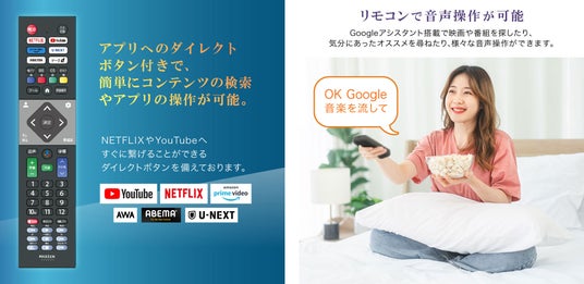 リモコンにはダイレクトボタンとGoogleアシスタントボタンが付いており、かんたんに操作することができます。ダイレクトボタンを押すと、Netflix、YouTube 、Amazon プライムビデオ、U-NEXT、ABEMAにすぐに繋がり、見たいコンテンツに手早くアクセスできます。また、Googleアシスタントボタンを押すことで音声入力が起動し、映画や番組を探したり、気分にあったオススメのコンテンツを尋ねたりと、様々な操作が音声で可能です。