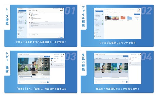 プロジェクト毎にデータやスケジュールの管理ができ、チャットや共有リンク機能でコミュニケーションがスムーズになります。また、動画に直接書き込みができるレビューチェック機能により、修正内容を簡単・すぐ・正確に伝えることが可能です。