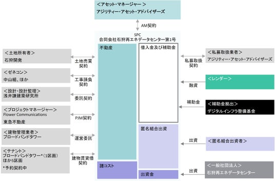 石狩再エネデータセンター第1号は、総務省の「令和3年度補正デジタルインフラ整備基金助成事業」に基づく一般社団法人情報通信ネットワーク産業協会(CIAJ)の助成金交付決定を受け2026年4月の開業にむけて北海道石狩での事業開始の準備をすすめてまいりました。東急不動産株式会社、株式会社Flower Communications及びアジリティー・アセット・アドバイザーズ株式会社が中心となり、浅井謙建築研究所株式会社の設計監理で、北海道石狩にオンサイトPPAを積極的に導入した再エネ地産地消型データセンターを建設いたします。資金調達の内容