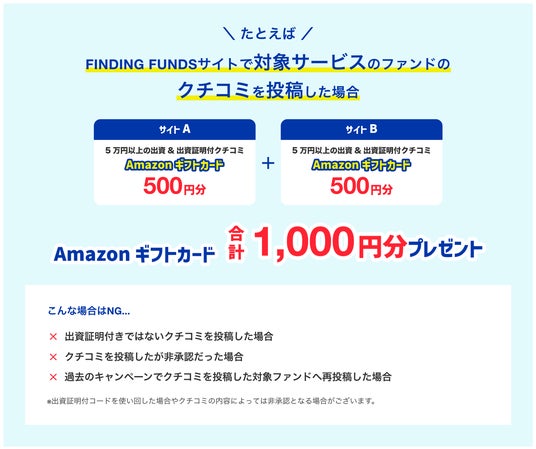 ファインディングファンドで対象サービスへの出資証明付クチコミを投稿し、クチコミが公開された方全員に「Amazonギフトカード500円分をプレゼント」するキャンペーン※です。1人100件分のクチコミが対象で、最大50,000円分まで獲得可能です。