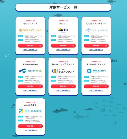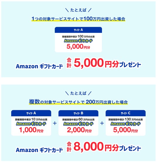 キャンペーン期間中に対象サービスに出資すると、出資額に応じて1サービスあたり最大で5,000円分のAmazonギフトをもれなくプレゼントするキャンペーンで、提携中の7サービス※合計で、35,000円分のAmazonギフトを獲得することができるキャンペーンです。