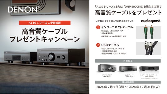 これに伴い、2024年7月1日(月)より「A110シリーズご愛顧感謝 高音質ケーブルプレゼントキャンペーン」を実施いたします。2024年7月1日(月)から2024年12月31日(火)までの対象購入期間中に、A110シリーズのSACDプレーヤー「DCD-A110」、プリメインアンプ「PMA-A110」、またはネットワークオーディオプレーヤー「DNP-2000NE」をお買い上げの上、キャンペーンにご応募いただいた方全員にAudioQuestのアナログインターコネクトケーブル「Chicago / 1.5m RCA」(日本未発売品)、またはUSBケーブル「Carbon / 1.5m / A to B」をプレゼントいたします。AudioQuestは米国カリフォルニア州に本拠を置く高級ケーブルブランドであり、同社のケーブルはデノンの製品開発用試聴室においてリファレンスケーブルとして使用されています。キャンペーン概要