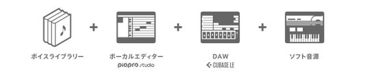 各製品には音楽制作に必要な作曲ソフト(DAW)も付属しているため、クリプトンの歌声合成ソフトウェア製品を一つ購入するだけで、パソコンを使用した音楽制作(DTM)をすぐに始めることが可能です。