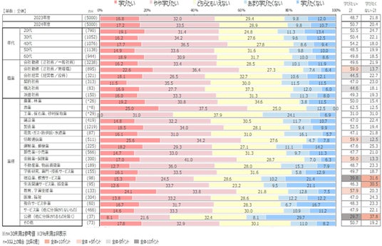 ・2023年度と変わらず、1,000人以上の企業ではたらく人の約7割、全体では約6割が「デジタルに関する学習は必要」と感じている。
