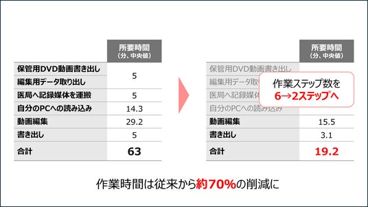 手術動画作成に関わる時間については、データ移行から動画作成までの時間が導入前では平均63分かかっていたのに対し、導入後では平均19.2分と、作業時間を約70%削減することに成功しました。