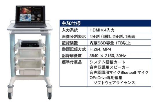 OPeDriveは、術野と周辺機器等の映像を最大4画面同時録画ができる手術記録システムです。記録システムの端末から編集用の端末へデータ転送ができ、専用の編集ソフトウェアを用いることで症例データの管理をすることや手術動画をスムーズに編集することができます。また、手術中に音声によるしおり挿入機能(挿入したしおりを起点にダイジェスト動画を簡単に作成する)を使用することで、動画作成時間を大幅に削減できます。