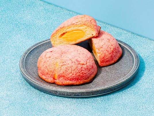 中には角切りの桃のコンポートを加えたクリームがたっぷり!表面は桃に見立てたサクサクのクッキー生地、内側はしっとりとふわふわのブリオッシュ生地で仕上げ、見た目も味も桃にこだわった1品。クリームは甘さ控えめ、爽やかな桃のおいしさを楽しめます。