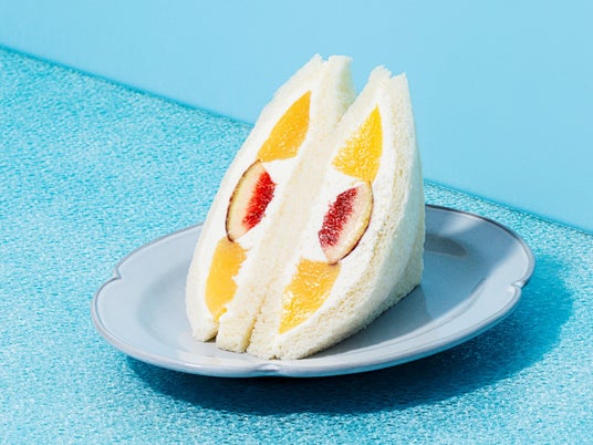 華やかな香りと爽やかな甘み、とろける舌触りが魅力の岡山県産「清水白桃」を使ったフルーツサンド。濃厚な甘みのイチジクも使われているほか、フルーツを際立たせるため、生クリームは甘さを控えミルク感たっぷりに。