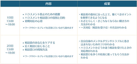 - 講座の内容内容は、ハラスメント防止に関する法律や事業主の防止義務/相談を受けた後の対処の流れ/ハラスメント相談の流れ/相談員自身の心を守るなど「ハラスメント相談を受ける」ことをトレーニングします。
