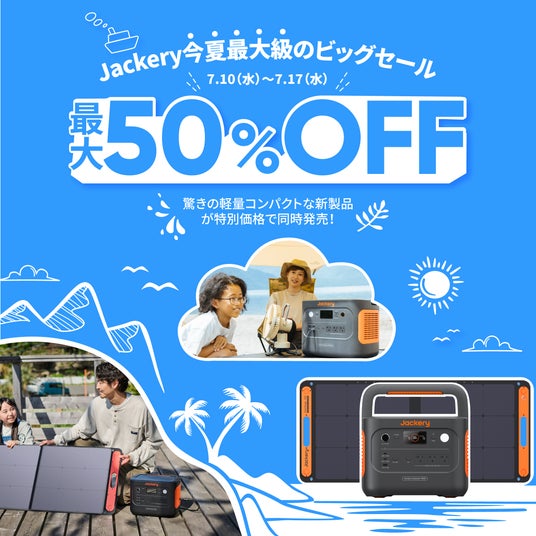 ポータブル電源・ソーラーパネルの世界的リーディングカンパニー・Jackeryの日本法人である株式会社Jackery Japan(本社:東京都中央区)は、2024 年7月10日(木)~7月17日(水)まで*¹、Jackery公式Amazon店や公式オンラインストアにおいて、ブランド史上最大50%OFFのビッグセールを開催いたします。期間限定の注目の目玉商品には、世界累計50万台以上販売したJackery元祖モデルからリニューアルした「Jackery ポータブル電源 240 New」、スペックやサイズもちょうどいい中容量モデル「Jackery ポータブル電源 600 Plus」、家電大賞2023-2024のアウトドア家電部門で金賞を受賞した人気モデル「Jackery Solar Generator 1000 Plus」も含まれています。さらに、7月10日(水)より発売のJackery新定番「Jackery ポータブル電源 1000 New」*²もお得な価格でご購入いただけます。