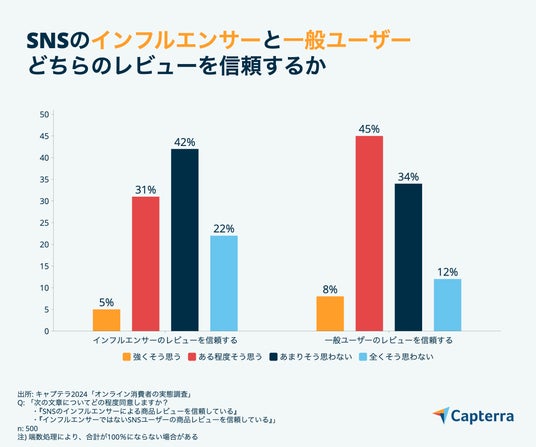 キャプテラ「2024年オンライン消費者の実態調査1.」:SNSのインフルエンサーと一般ユーザーどちらのレビューを信頼するか