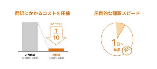 従来の人力翻訳と比較して約1/10のコストを実現し、中小企業や個人クリエイターのグローバル展開を強力に支援します。さらに、最短1営業日での納品を可能にする圧倒的な翻訳スピードにより、企業やクリエイターのグローバル発信を加速させます。