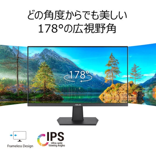 ・23.8型フルHD(1920×1080)IPS 178°広視野角パネルを採用したフレームレスデザイン