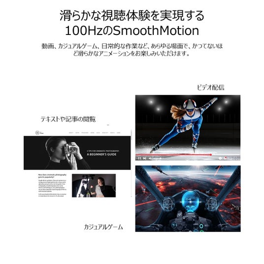 ・SmoothMotion、VRR(可変リフレッシュレート)有効にすることで100Hzのリフレッシュレートと応答速度1ms(MPRT)がティアリングのないシームレスな映像体験を提供