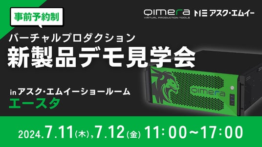 株式会社アスク (本社 : 東京都千代田区) は、2024 年 7 月 11 日 (木) ~ 12 日 (金) の2日間、グリーンバックが常設された同社ショールーム『エースタ』にて、リアルタイムでのバーチャル制作を叶える合成システム 『Qimera』を実際にご覧いただけるデモ見学会を開催いたします。このデモ見学会では、Qimera の基本操作や具体的な活用方法について、専門スタッフがスタジオでの実演を交えながらご紹介いたします。また、NAB 2024 で発表された最新機能のデモンストレーションもお見せする予定です。CG 合成を活用した高度な映像制作や、リアルタイムでの合成技術にご興味のある方向けのイベントとなっております。本イベントへの参加は無料で、各時間枠につき 1社様のみ ご参加いただけるプライベート内覧会 (事前予約制) です。1社様につき、最大5名様 の参加が可能です。デモ見学会へのご予約は、Peatix ページ よりチケットのお申し込みをお願いいたします。実際にバーチャルプロダクションをグリーンバックスタジオで体験いただける貴重な機会となりますので、ぜひご参加ください。皆様のご参加を心よりお待ちしております。