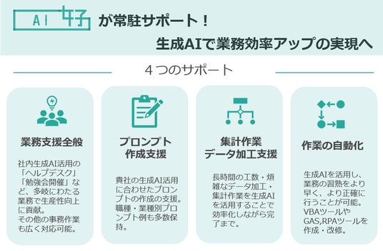 「EXCEL女子」「デジマ女子」「RPA女子」等、コクーの既存事業で活躍しているメンバーが、Excelスキル、VBA、RPA、デジタルマーケティングといった専門スキルに生成AI技術を組み合わせたスキルを持つのが「AI女子(R)」です。企業の業務効率化を強力にサポートします。