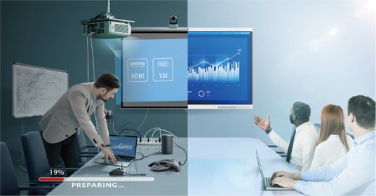 いまやビジネスでは必須となったリモート会議ですが、ひとつの会議室でそれを実現しようとすると予想以上にたくさんのものが必要でした。映像を投影するためのプロジェクターやマイク、スピーカー、外付けカメラ。またアイデアを形にするためのホワイトボードなど。今までの会議室でDX化を目指そうとすると雑然としてしまい、また接続や設定の面でもトラブルが発生しがちでした。しかし、ひとつの製品にこれらすべての機能をパッケージした「スマートAIボード」はオフィスがすっきりとまとまり、機能面においても機器間の接続や個々の設定に煩わされることなくビジネスのDX化を強力に推進します。