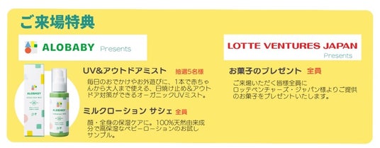イベントには1人でも多くの方にご参加いただけるよう、参加費は無料、オンラインでもご参加いただけます。国産オーガニックスキンケアの「ALOBABY(アロベビー)」を展開する株式会社SOLIA様と、顧客視点を大切にする起業家に「愛」をもって寄り添う投資会社の株式会社ロッテベンチャーズ・ジャパン様のご協賛により親子で嬉しいご来場者特典をご用意しております。