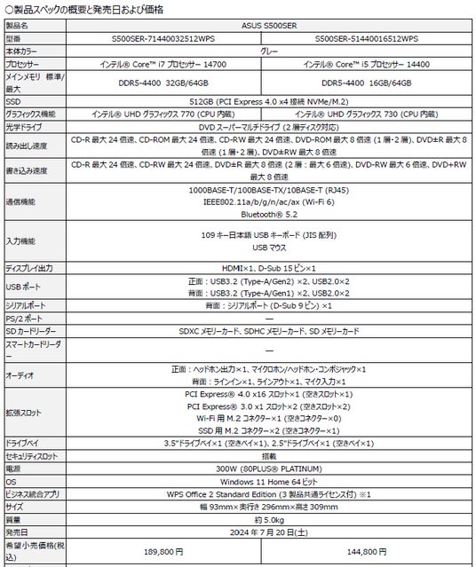 第14世代インテル(R) Core(TM) プロセッサーを搭載し、置く場所を選ばないコンパクトなサイズを実現した「ASUS S500SER」を発表