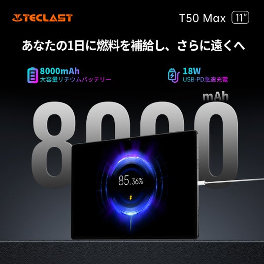 堅牢な8000mAhポリマーリチウムバッテリーを誇るTeclast T50 Maxタブレットは、長時間の作業にも対応し、何時間でもエンターテイメントを楽しむことができ、常に充電を必要とせずに接続を維持することができます。USB-PDと互換性のある18Wの急速充電は、迅速なエネルギー補給を保証します。