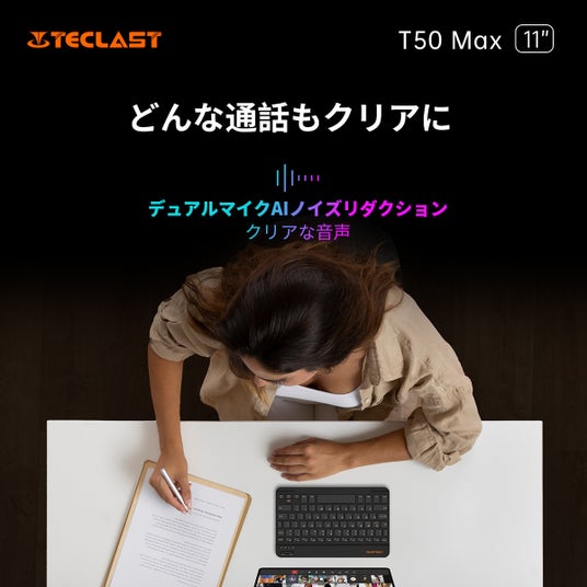 Teclast T50 Maxタブレットは、デュアルマイクAIノイズリダクション技術により、音声の明瞭さに優れており、騒がしい環境でも通話や録音でクリアな音声を実現します。精密なAIアルゴリズムによって強化されたこのテクノロジーは、音声の明瞭度を向上させるだけでなく、シームレスなコミュニケーションと洗練された音声コマンド認識のためのタブレットの機能を強化します。