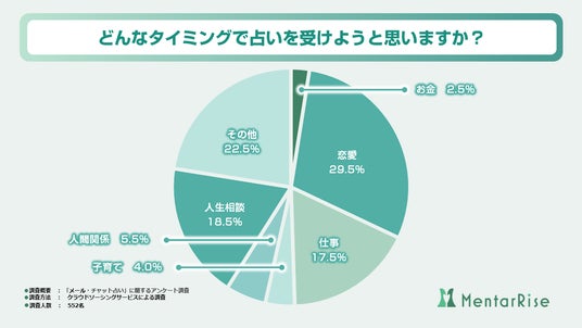 「どんなタイミングで占いを受けようと思いますか?」という設問に対して得られた回答は、上記の円グラフのような結果となりました。