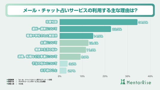 これにより、「メール・チャット占いサービス」に寄せられる悩み相談や人生相談や運勢診断などは、従来の対面占いや電話占いに寄せられていた利用理由と同じ傾向にあることがわかりました。